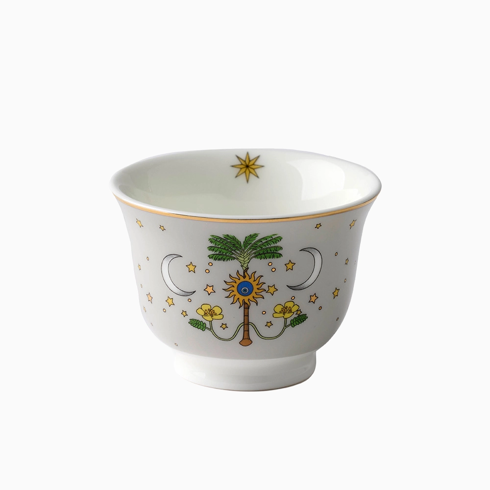 عزز مجموعتك مع طقم فناجين شفة جيو غولد. مصنوع من البورسلين الفاخر، يتميز هذا الطقم بنقوش النخيل، والعين الزرقاء للحماية، والنجوم، والهلال الهادئ. يضفي دفئ ورقي على جلساتك ولحظاتك المميزة مع الأحباء.