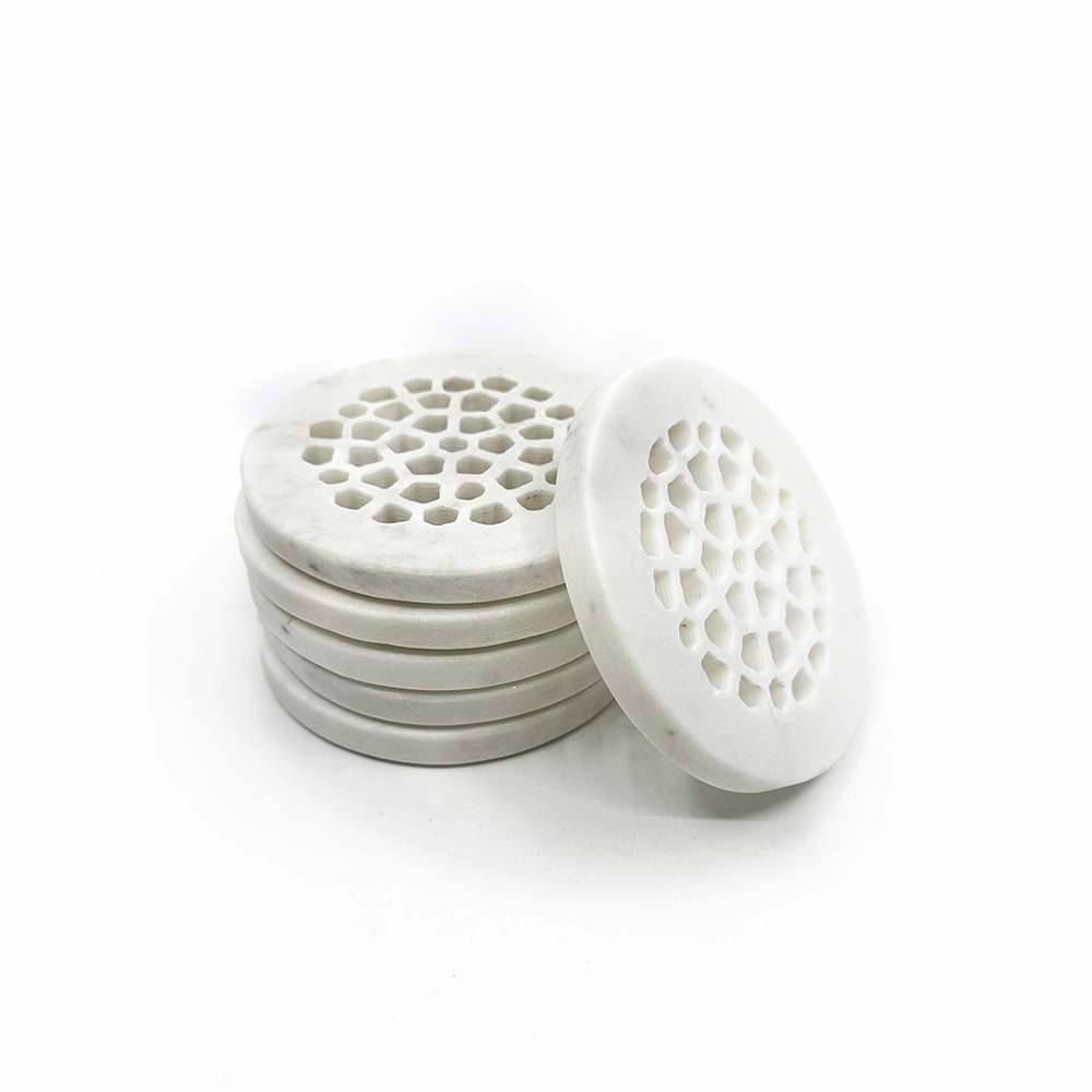 Bring a refined touch to your table with this set of white marble coasters. Crafted from sturdy marble, it features distinct cut-out patterns, combining practicality and elegance to suit any occasion.